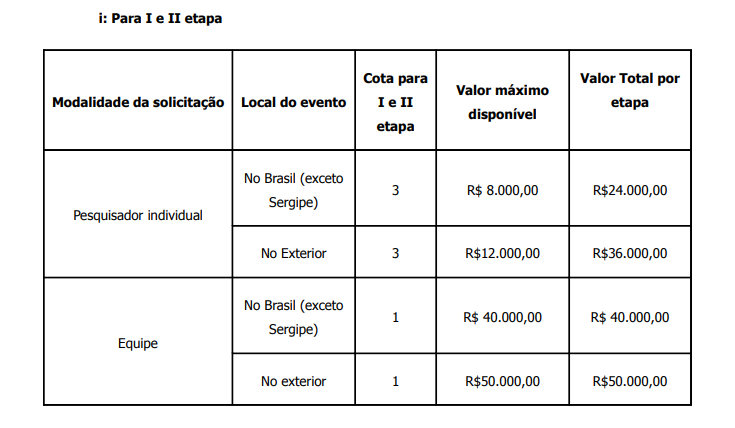 Apoiar parcial ou integralmente a apresentação de trabalhos resultantes de projetos financiados pela Fundação, desde que os projetos estejam em andamento ou tenham sido concluídos em 2026, em eventos de curta duração e caráter técnico-científico, realizados fora do Estado de Sergipe.