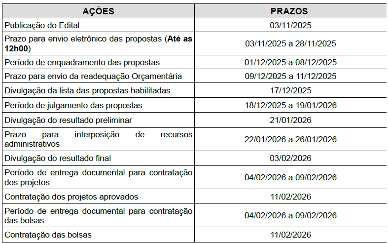 Para a execução deste projeto serão concedidas 04 (quatro) quotas de bolsas na modalidade de Iniciação a Extensão (IEx), com vigência de até 12 (doze) meses.