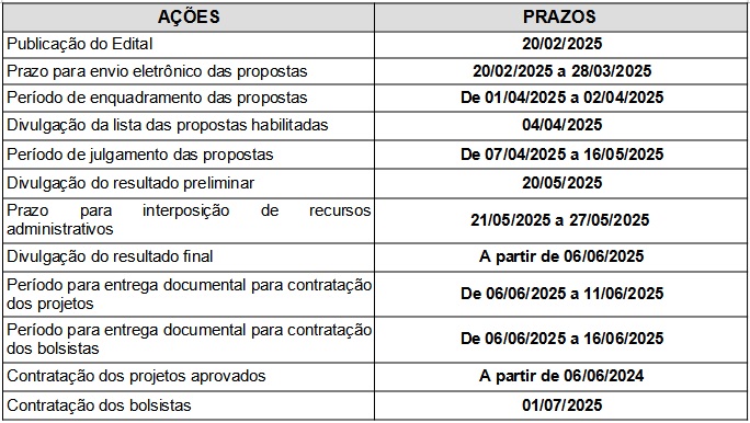 Bolsas de Iniciação Científica (IC): serão concedidas 02 (duas) quotas de bolsas de iniciação a extensão, sendo uma por projeto, com valor individual de R$ 700,00 (setecentos reais), por um período de até 12 (doze) meses.