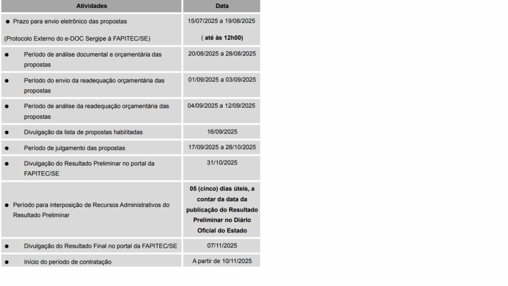 O Edital prevê um valor global de R$205.000,00(duzentos e cinco mil reais), oriundos do Fundo Estadual para o Desenvolvimento Científico e Tecnológico – FUNTEC, sob a gestão da Secretaria de Estado do Desenvolvimento Econômico e da Ciência e Tecnologia (SEDETEC), e repassados à FAPITEC/SE, para implementação de até 08 (oito) projetos de Olimpíadas de Ciências;